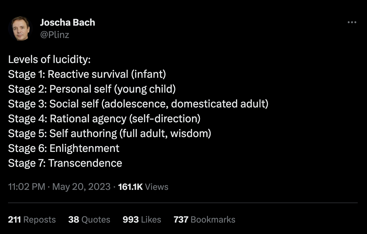 Joscha discusses the stages of lucidity that to me are similar to Maslow's pyramid but with the twist of contemplating additional stages on your way to self-actualization.
